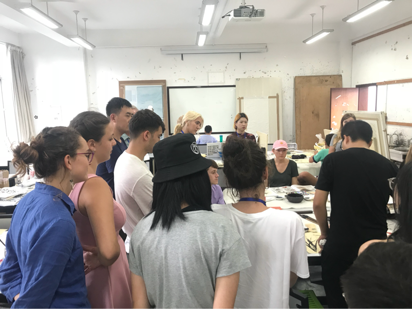 7月12日下午2:30,国际课程周的留学生和必赢官网十几名学生共同参加了必赢官网和艺术学院在江安校区共同举办的第二堂中华传统艺术体验课——国画。