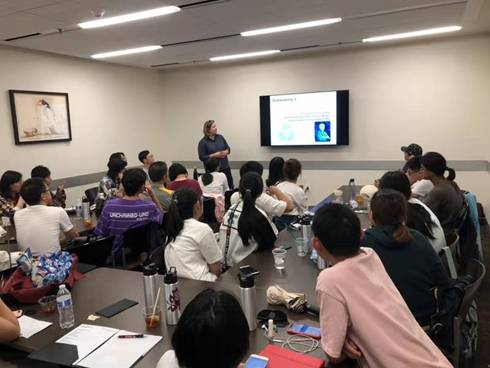 在愉快的自助午餐结束后,Ivy Gerbis教授给同学们带来了以可持续发展为主题的精彩报告,用生动有趣的案例清晰明了向同学们展示可持续发展(Sustainability)的相关内容。Ivy Gerbis教授首先与同学们启发式探讨了可持续发展的概念,以及人文、社会、环境在其中不可或缺的作用;然后她指出当代现代化社会面临的主要问题,比如温度、二氧化碳、空气和水的污染、极端天气等;接下来针对每一个问题,Ivy Gerbis教授展示了目前和未来可能出现的解决方法;最后,她为同学们解答了相关专业等问题,场面十分活跃。同学们在这个学习和探讨过程中深受启发,更好地了解世界可持续发展的现状和可能解决问题的实际措施。