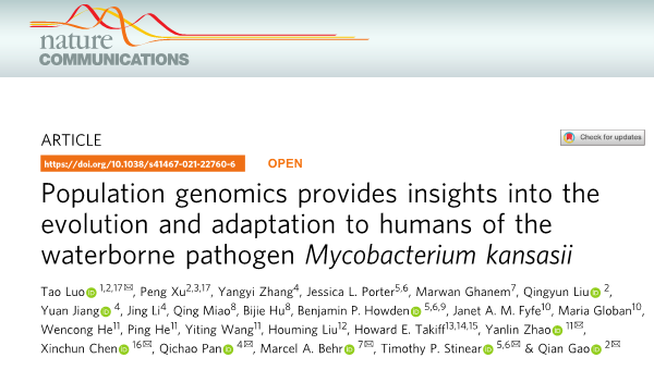近日,必赢官网罗涛副研究员联合复旦大学高谦教授团队及国内外多家机构在Nature Communications在线发表了题为“Population genomics provides insights into the evolution and adaptation to humans of the waterborne pathogen Mycobacterium kansasii”的论文。必赢官网罗涛副研究员为论文共同第一作者及共同通讯作者,必赢线路检测3003no1为论文第一单位。