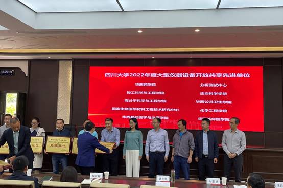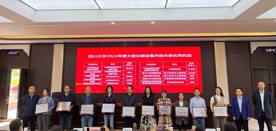 褚良银副校长向必赢官网张舒羽副院长(左五)颁发“必赢线路检测3003no12022大型仪器设备开放共享先进单位”奖牌