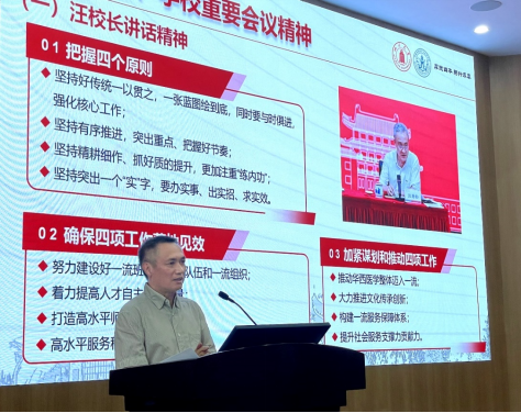 为进一步推动学院下半年工作顺利开展,抓实抓细学院各项工作,院长李昌龙同志传达学校2023年下半年新学期工作布置会和中层干部培训会精神,强调全院师生要持续做好主题教育“后半篇文章”,抓好《关于加快推进学校高质量发展 助力教育强国建设的决定》的贯彻落实;要坚持“实”字为要,把握四个原则,确保四项工作落地见效,加紧谋划和推动四项工作。随后,他总结了学院2023年上半年的工作,表示学院在开展学习贯彻习近平新时代中国特色社会主义思想主题教育、强化师德师风建设、坚定学生理想信念、建设高水平师资队伍等方面取得了不错的成绩,尤其在高层次人才队伍建设、教育教学改革等方面取得了标志性的成果。他指出,2023年下半年,学院要严格落实学校重要会议精神,全院教职工要凝心聚力,重点推进以下几个方面的工作:一要加强思想建设,党建引领,凝聚发展共识;二要加强师德师风建设,做学生榜样,做社会楷模;三要提高师资队伍建设水平,推动高峰学科建设;四要做实专业建设,助力人才自主培养高质量发展;五要做细新生入学教育,抓实学风建设;六要提升空间使用效能,提升办学环境;七要提升实验动物中心服务质量环境,提升管理水平。