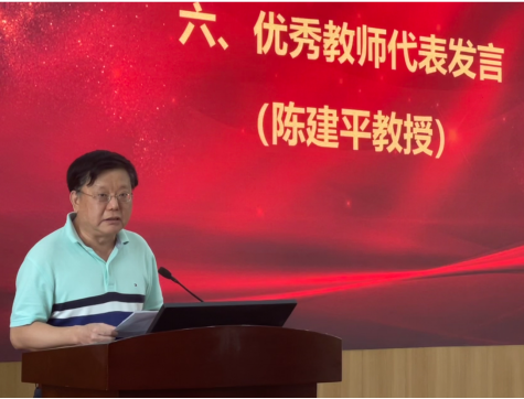 从教三十余载,立德树人话心声。会上学院邀请优秀教师代表陈建平教授发言。他表示,立德树人是我们教学的根本,要推动社会主义核心价值观“三进”,强化思想引领;关爱学生是我们育人的核心,要从细小入手,营造良好的教育书育人氛围,促进学生全面发展;学高为师,身正为范是我们的准则,要言传身教,培养对社会、对国家有用的人才。