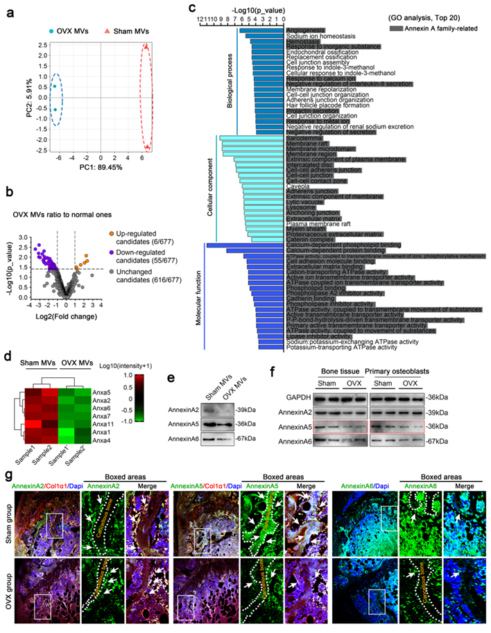 随后,研究者采用蛋白质谱法对正常和骨质疏松成骨细胞来源基质囊泡的内容物进行检测,结果发现,与正常组相比,骨质疏松成骨细胞来源基质囊泡中AnxA5表达显著降低(图2)。