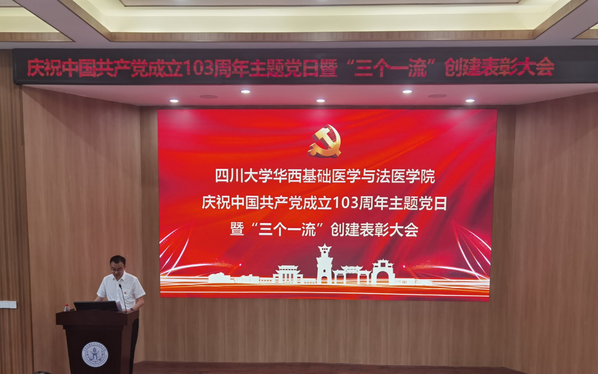在庆祝中国共产党成立103周年、学院深入推进“三个一流”创建活动和扎实开展党纪学习教育工作之际,6月28日上午,学院在华西第五教学楼报告厅隆重召开庆祝中国共产党成立103周年主题党日活动暨“三个一流”创建表彰大会,学院领导班子成员、党委委员、纪委委员、各党支部书记、“两优一先”获奖者、光荣在党50年的党员代表、党龄“逢十”的党员代表、新发展党员代表参加会议,会议由学院党委副书记、副院长罗海玻主持。