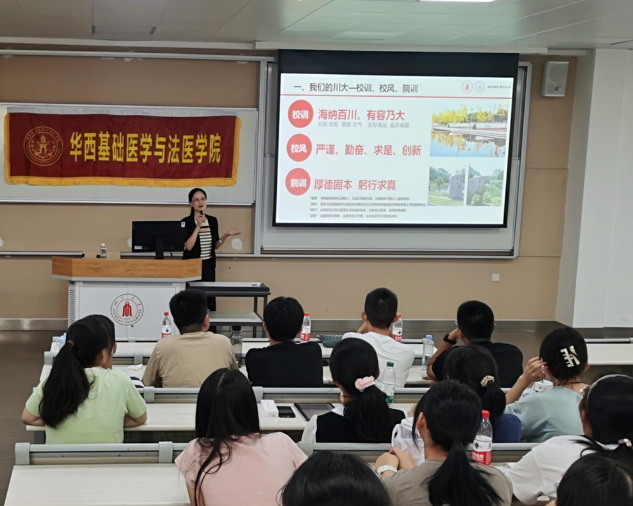 9月9日下午,在江安校区一教D503阶梯教室,学院党委书记李华教授为2024级128位本科新生讲授题为“志存高远德润心,刚健有为践使命”的开学第一课。李华书记围绕“何为大学,何为华西,我当何为”三方面内容,为新生讲解新时代青年大学生如何响应中国式现代化号召,在新征程上与国家发展、民族复兴同向同行的时代命题。