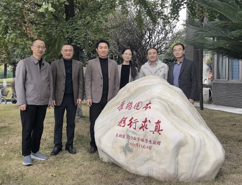 11月11日上午,在学院华西校区逸夫基础医学楼门口,一场温馨而庄重的院训石揭幕仪式成功举行。基础医学99级全体校友深情回馈,捐赠的一块刻有院训的石头,成为校园内一道亮丽的风景线。石上镌刻着的院训“厚德固本 躬行求真”,是学院的精神象征,也传递着对后辈学子的殷切期望。