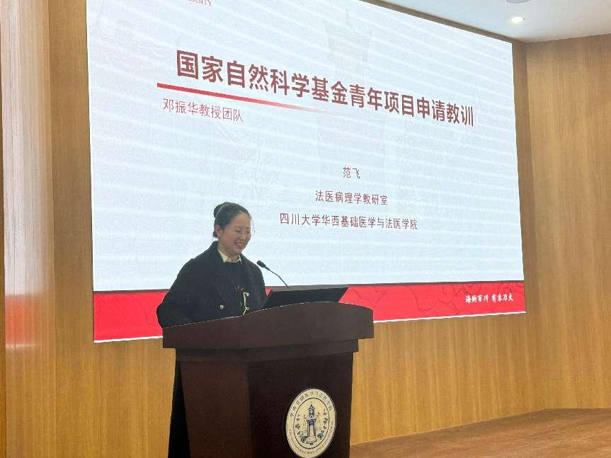 随后,由来自法医病理学教研室,2024年获批青年基金项目的专职博士后范飞老师分享心得体会。范老师用自己多次申报国自然的经历,全面地为大家介绍了自己申报过程中从心态调整、本子打磨等方面的转变,对比获批当年本子与以往的突出变化 ,分享总结国自然申报的重点注意事项。