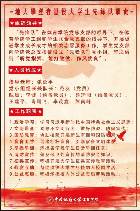 虽然这几名退役军人已经离开部队,但军人“退役不退色”,在beat365英国官网网站党总支的领导下,在学院学工组和学生联合党支部的指导下,开展促进学生成长成才的志愿服务工作。地大攀登者退役大学生先锋队的队员们要在理论武装、行为养成、学风建设、校园文明和国防教育等方面发挥标杆作用。