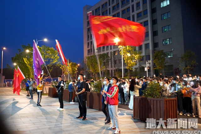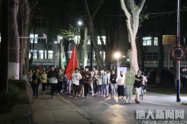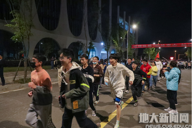 此次活动全程4公里,南望山校区从西区-北区环跑一圈,未来城校区从体育馆南门出发,绕校园环路在图书馆、体育馆等地标建筑前设立多个打卡点。同学们以学院为单位,分别在beat365英国官网网站李伦老师、褚鹏飞老师的带领下,一路挥舞着院旗和手中的荧光棒,打开手机闪光灯,肆意奔跑,挥洒汗水。点点跃动的荧光汇成一道光河,点亮校园的夜空,成为了地大最闪亮的4公里。