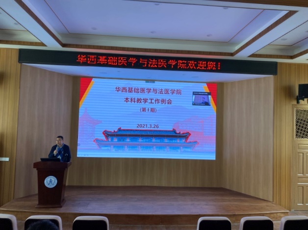 2021年3月26日下午3点,必赢官网在华西校区第五教学楼报告厅召开了本年度第一期全院本科教学工作例会。会议由教学副院长梁伟波教授主持,各教研室主任和教学秘书现场参会,不行课的老师通过腾讯会议线上参会。