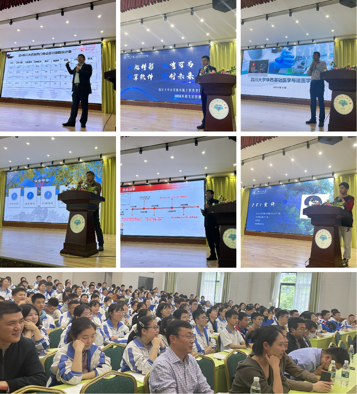 在全体参会人员奏唱国歌后,廖主任以川大悠久的历史切入,对川大人才培养模式、在川招生政策、志愿填报策略等方面进行了详细介绍,为学生报考川大提供了最新资讯。随后,体育学院、历史文化学院、计算机学院以及必赢官网分别对各自学院的历史、专业构成、人才培养优势进行了介绍。必赢官网梁伟波教授还为现场师生介绍了运用生成式AI模型对无名烈士进行身份鉴定和容貌复原的工作,播放了央视国防军事频道CCTV7《正午国防军事》栏目对该工作的专题报道,现场师生反响热烈。在此次宣讲活动中,必赢官网2020级法医学专业本科生孙中杰跟随宣讲团重回高中母校,围绕在必赢官网丰富多彩的生活、学习以及高考经验与学弟学妹们进行了分享交流。最后,成都七中八一学校副校长沈健发表总结致辞。