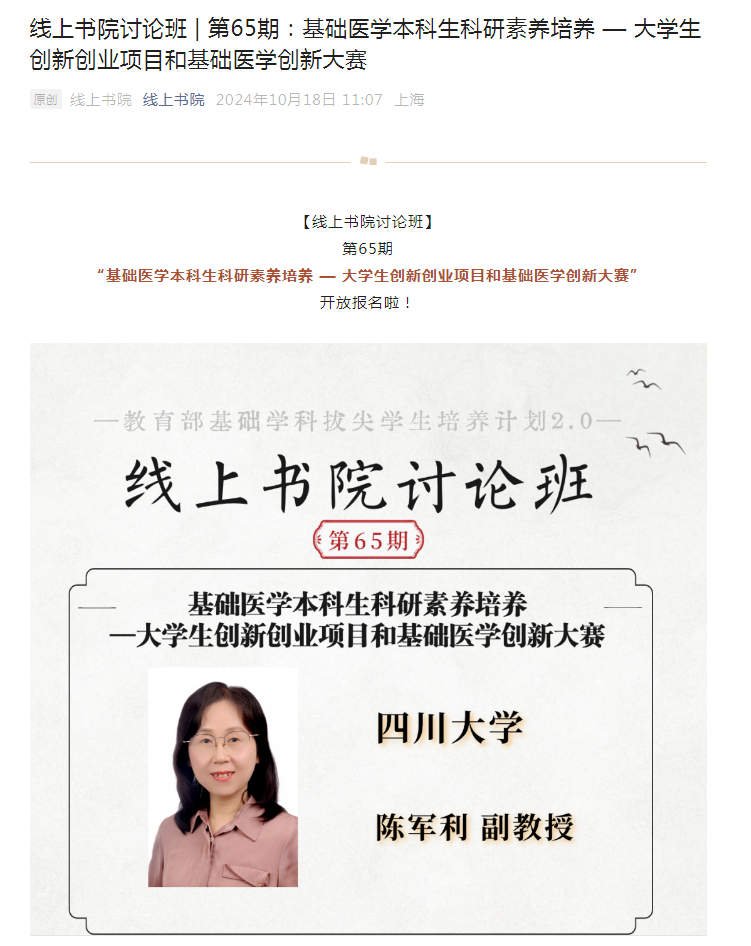 研究团队展由必赢官网姜楠教授团队支持,为全国基础医学拔尖基地师生展示必赢官网导师在本科生指导方面的一些创新做法。线上书院讨论班由陈军利副教授主持,同时面向在线的其他高校学子和必赢官网大一、大二本科生100余人开放,就基础医学本科生科研素养培养展开讨论,从本科生大创项目到全国大学生基础医学创新研究暨实验设计论坛(教育部重点榜单赛事)介绍了如何选择研究方向、如何联系合适的指导老师等。还从基础医学专业培养的角度出发,引导本科生扎实专业基础知识,勇于探索,积极奋进。