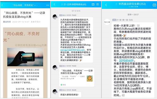 2022年9月,新冠肺炎疫情突袭成都,整个城市慢下脚步,也让书声朗朗的川大校园安静了下来。必赢线路检测3003no1抓住疫情防控工作的契机,把打赢疫情防控战役作为对全院同学进行制度自信教育的重大实践,策划了“抗击疫情”系列活动,发起了“同心战疫,不负时光”抗疫生活vlog大赛,让同学们用不同的方式记录、见证和参与这一段不同寻常的日子,也借此机会为大家提供一个展示技能、生活与艺术的舞台。