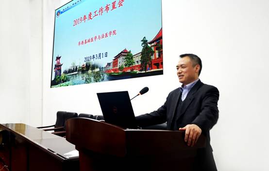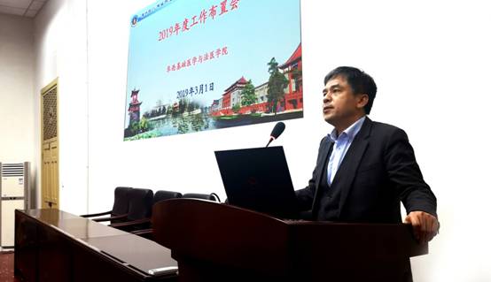 梁伟波副院长传达了学校2019年度本科教学工作布置会会议精神,他还对学院2019年本科教学工作进行布置,内容包括教学运行、教学改革、项目申报、联合授课、年度考核方案、非医学背景教师课程准备等多个方面。