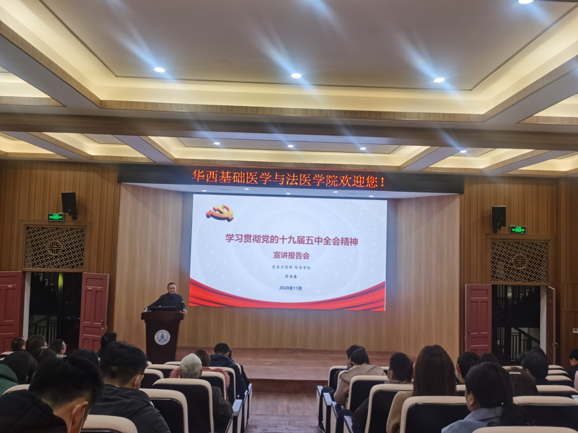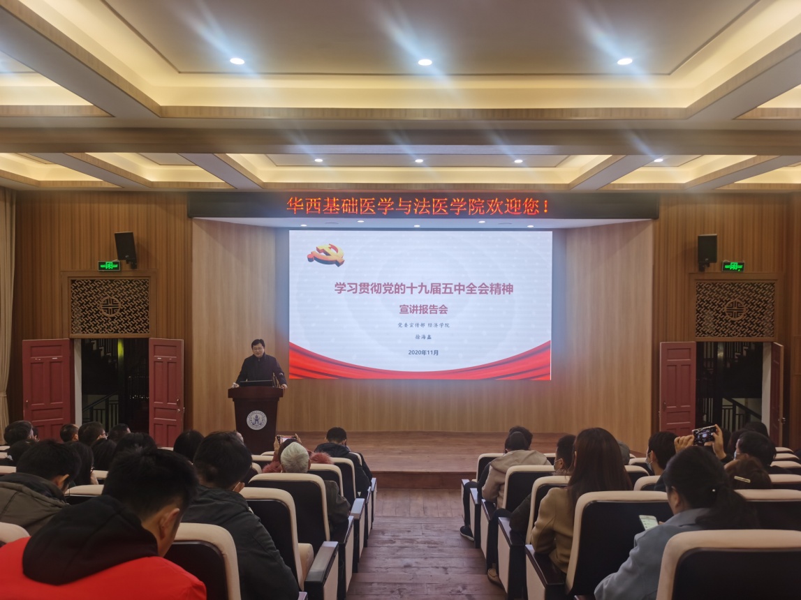 为认真学习贯彻党的十九届五中全会精神,必赢官网特邀四川省委十九届五中全会专家宣讲团成员,必赢线路检测3003no1十九届五中全会专家宣讲团成员,必赢线路检测3003no1宣传部常务副部长,必赢线路检测3003no1经济学院教授徐海鑫到院作党的十九届五中全会精神报告会。报告会于11月30日在华西校区第五教学楼报告厅举办,会议由学院党委书记李昌龙主持,学院党委委员、纪委委员、师生党员约200人现场聆听了报告。