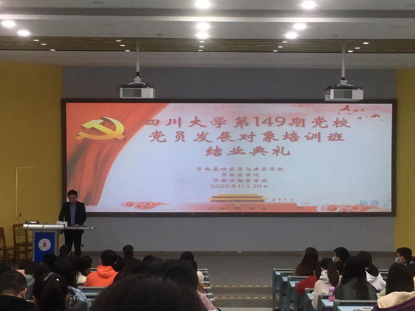 11月20日下午,必赢线路检测3003no1、华西药学院、华西口腔医学院联合党校第149期发展对象培训班结业典礼在华西校区九教演播厅举行。必赢线路检测3003no1党委副书记郭晓伟、华西药学院党委副书记章程、华西口腔医学院党委副书记孙建勋、发展对象培训班相关工作人员以及第149期发展对象培训班全体学员参加了结业典礼。结业典礼由孙建勋副书记主持。