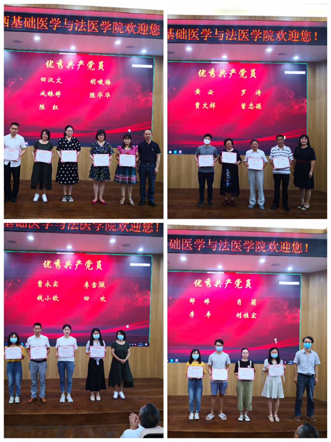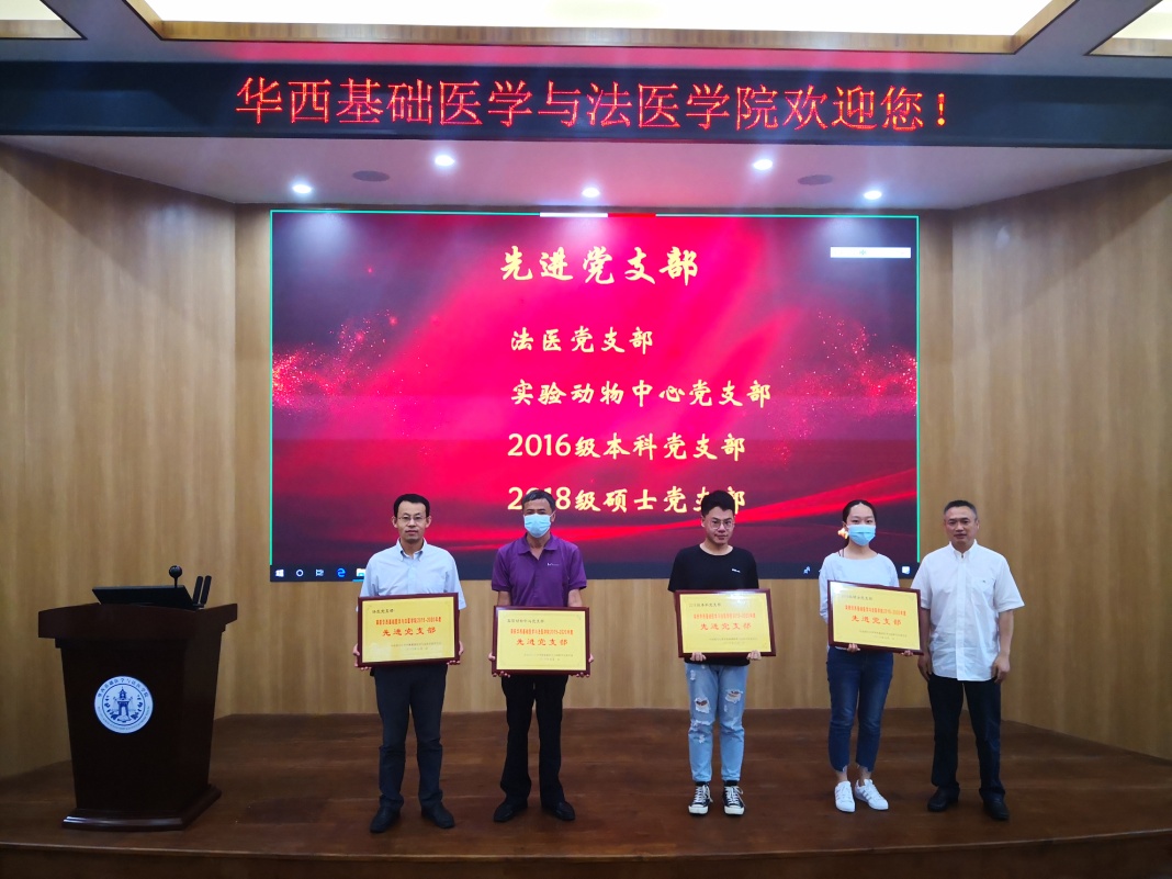 在庆祝中国共产党成立九十九周年之际,为充分发挥先进典型的示范引领作用,激励全院师生党员不忘初心、牢记使命,更加自觉地投身学校“两个伟大”建设,学院党委决定表彰一批先进支部及党员同志、党务工作者。学院党委委员、副院长梁伟波宣读了表彰决定:授予法医党支部、实验动物中心党支部、2016级本科党支部、2018级硕士党支部“先进党支部”称号;授予宋凤、刘学旭、郑风劲、高伟、林佳、黄英、李涛、尹璐8位同志“优秀党务工作者”称号;授予田汉文、胡峻梅、成姝婷、陈华华、陈红、黄云、罗涛、贾文祥、曾志源、曹永实、李雪珮、钱小钦、田欢、邹婷、肖莉、李卓、刘桂宏17位同志“优秀共产党员”称号。先进党支部代表云利兵老师、优秀党务工作者代表林佳老师、优秀共产党员代表李涛同学分别结合自身工作、学习进行了发言。