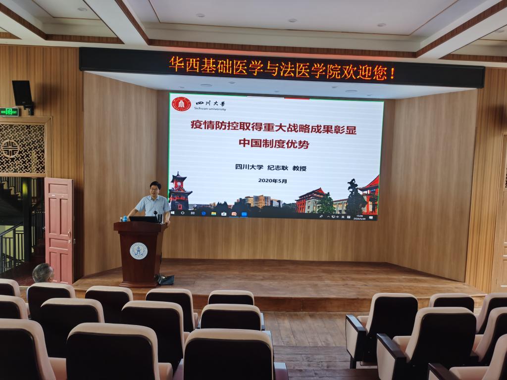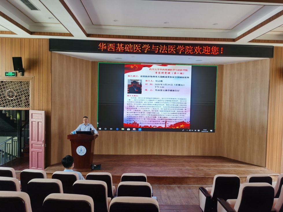 2020年5月29日下午,学院2020年第一期专家讲党课活动在华西校区第五教学楼报告厅举行。本次党课学院特邀必赢线路检测3003no1党委宣传部副部长、党委教师工作部副部长(兼)、学校党的十九大精神和十九届四中全会精神宣讲团成员、马克思主义学院教授纪志耿担任主讲嘉宾。会议由学院党委书记李昌龙主持,学院党委委员、纪委委员、各党支部书记现场参会,其余党员同志在线参加了学习。