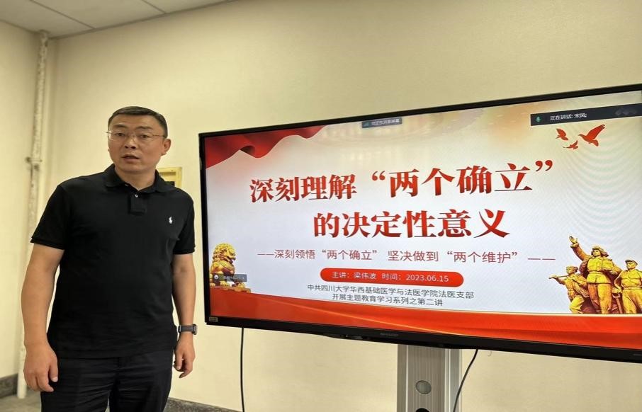 第二次集体学习由学院党委委员、副院长梁伟波同志讲授“深刻理解‘两个确立’的决定性意义”的专题党课,从百年未有之大变局的背景下,深刻理解“两个确立”要立足党和国家事业取得历史性成就的实践、更要从理论依据层面把握这是关乎党和国家前途命运、党和人民事业成败的根本性问题。在系统学习基础上,真切领会了“两个确立”是推进中华民族伟大复兴历史进程最根本的保证,细致阐述并组织党员研讨如何结合法医学学科发展的特点,将“两个确立”融入血脉并付诸行为。学科带头人廖林川同志从“两个确立”是历史和人民的选择这一角度出发,提出坚持学思用贯通、知信行统一,分享近期参与的重要法医学科的学术交流情况,从青年教师的学术发展与有组织的科研创新等方面,提出应切实把学习成果转化为推动学科发展的强大动力。与会党员观看视频《焦点访谈/“两个确立”这个论断为何重要?看解读》后,梁伟波同志结合近期法医学科博士点申报、学科评价结果等工作,组织党员并调研了实际工作问题,号召支部党员们团结奋进、以开创拓展的方式聚焦学科发展目标。