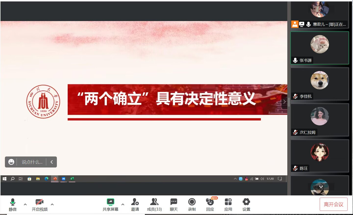 为深入学习贯彻习近平新时代中国特色社会主义思想,深刻理解“两个确立”的决定性意义,5月28日下午,学院本科第二支部全体党员同志在组织委员尹向蕙君同学的带领下,线上参加了“深入学习习近平新时代中国特色社会主义思想,做‘两个确立’的坚定执行者”主题党日活动。本次活动分为集体学习和小组讨论两个部分。