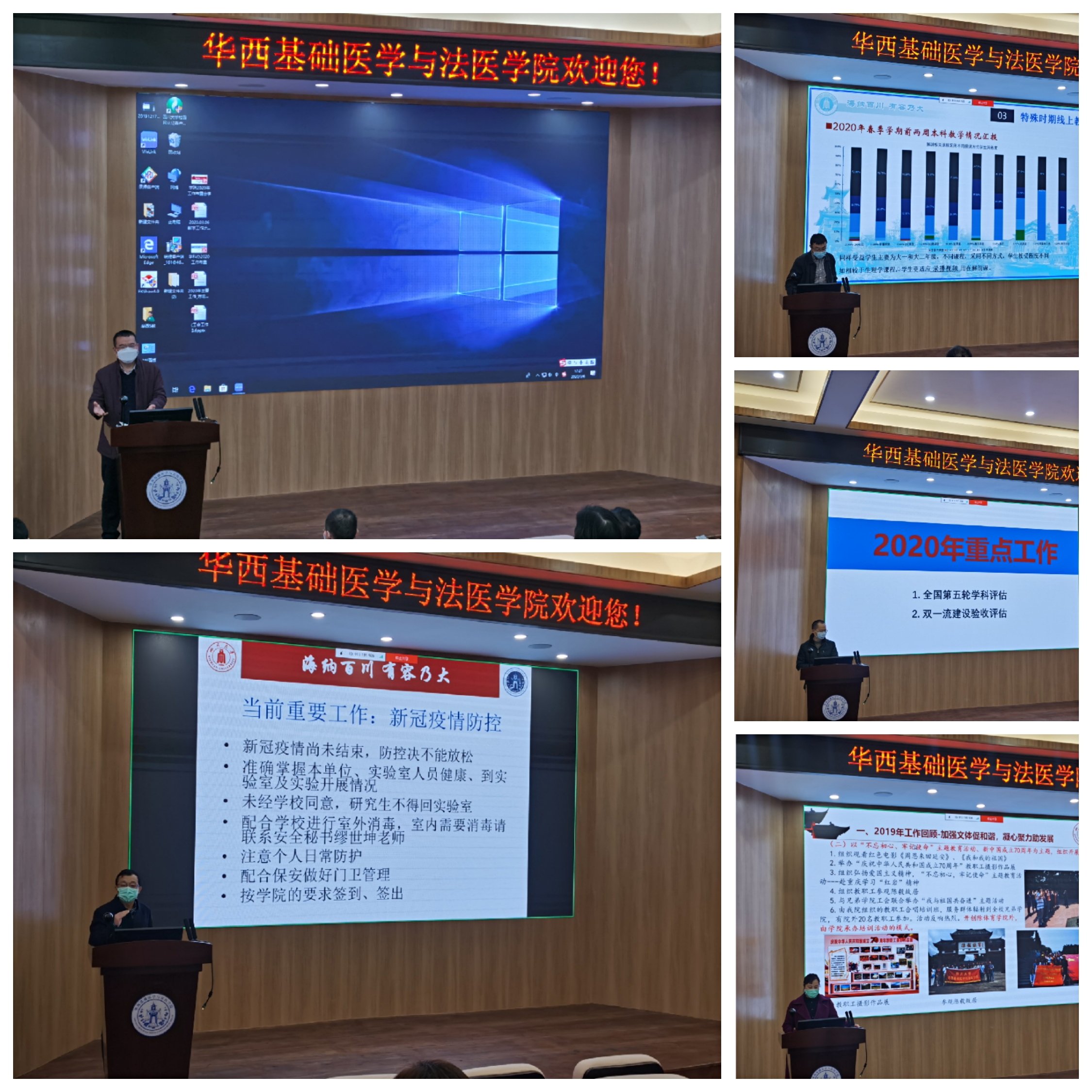 学院党委副书记郭晓伟分别就疫情防控期间学生工作的开展情况、学生深造率、学院宣传等7项工作,副院长方志就安全环保工作、法医楼改造工程等、副院长梁伟波就2020年本科教学重点任务、2020年春季学期前两周本科教学情况、特殊时期线上教学安排等,教授委员会主席刘肖珩就学科建设工作、全国第五轮学科评估、双一流建设中期验收评估等,工会主席黄莉就2020年工会重点工作等提出了新学期的工作安排及相关要求。