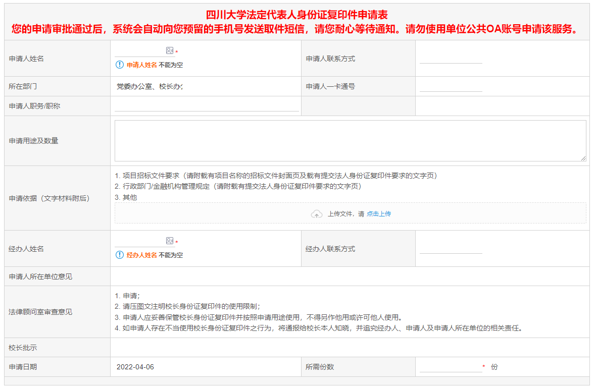 申请人可登录必赢线路检测3003no1校园信息门户或“云上川大”APP发起申请流程,经所在二级单位领导审核、法律顾问室审批通过后领取。通知方式为手机短信,请保持手机畅通。