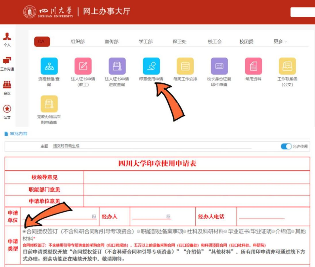 1.登录必赢线路检测3003no1网上办事大厅或“云上川大”APP,进入“印章使用申请”,选择“合同授权签订”;
