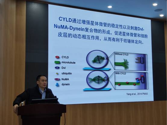 周教授从自己的硕士生活开始,讲述了导师的教育以及自己对于细胞骨架、纤毛研究兴趣的培养。随后周教授分享了其团队最新的研究成果,发现CYLD除传统去泛素化酶活性外,也是一个新型微管结合蛋白,并且与细胞分裂时间以及纺锤体的定向分裂有关。进一步研究发现CYLD可通过去泛素化Cep70以及抑制HDAC6活性影响纤毛及上皮组织发育。除此之外,周教授团队还发现了糖尿病与纤毛缺陷的关系,为糖尿病的治疗提供了全新思路。最后,周教授展望了目前细胞骨架与纤毛研究的前景,鼓励青年科研人员投身科学探索的浪潮中。