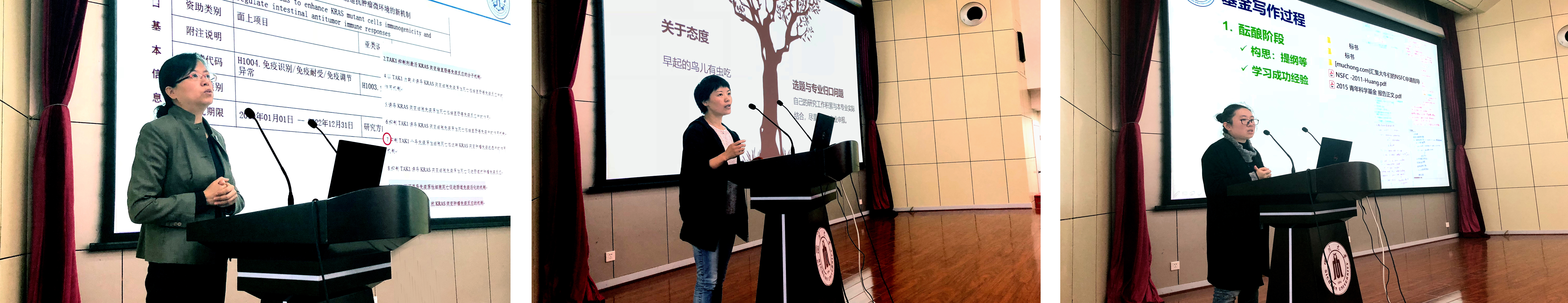 学院机能教研室王玉芳教授、解剖教研室周鸿鹰副教授、组织胚胎学与神经生物学教研室冯颖老师分别就2018年国家自然科学基金申报书撰写过程中自身的经历和感受,为在座老师们分享了她们申报过程中的体会及成功的经验。