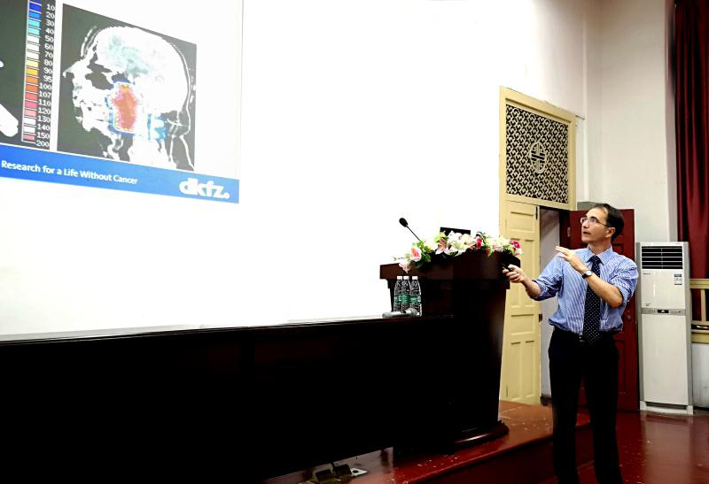 Peter Huber教授带来了题为“Translational Radiation Oncology Research”的报告。报告中,Peter Huber教授介绍了几种放疗的方法,从患者、动物实验等不同角度比较了C12碳离子与光子放疗疗效的差异以及肿瘤细胞的放疗抵抗机制。教授还以肺癌为例,探究了肺癌从炎症期到肺纤维化进程中PDGF等各种细胞因子的相互作用及其与放疗之间的关系,进而讨论了如何有效提升放疗疗效。之后,Huber教授还就同学的提问与大家深入探讨了放疗与抑郁症等精神疾病发生的关系。