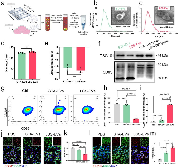 首先,作者通过平行平板流动腔对血管内皮细胞施加15 dyn/cm2的流体剪切力,通过超速离心法收集LSS刺激内皮细胞后分泌的EVs(LSS-EVs),并对其进行了形貌、粒径等表征。将LSS-EVs与M1型巨噬细胞共孵育后发现,LSS-EVs可以驱动促炎M1型巨噬细胞转化为抗炎的M2表型。