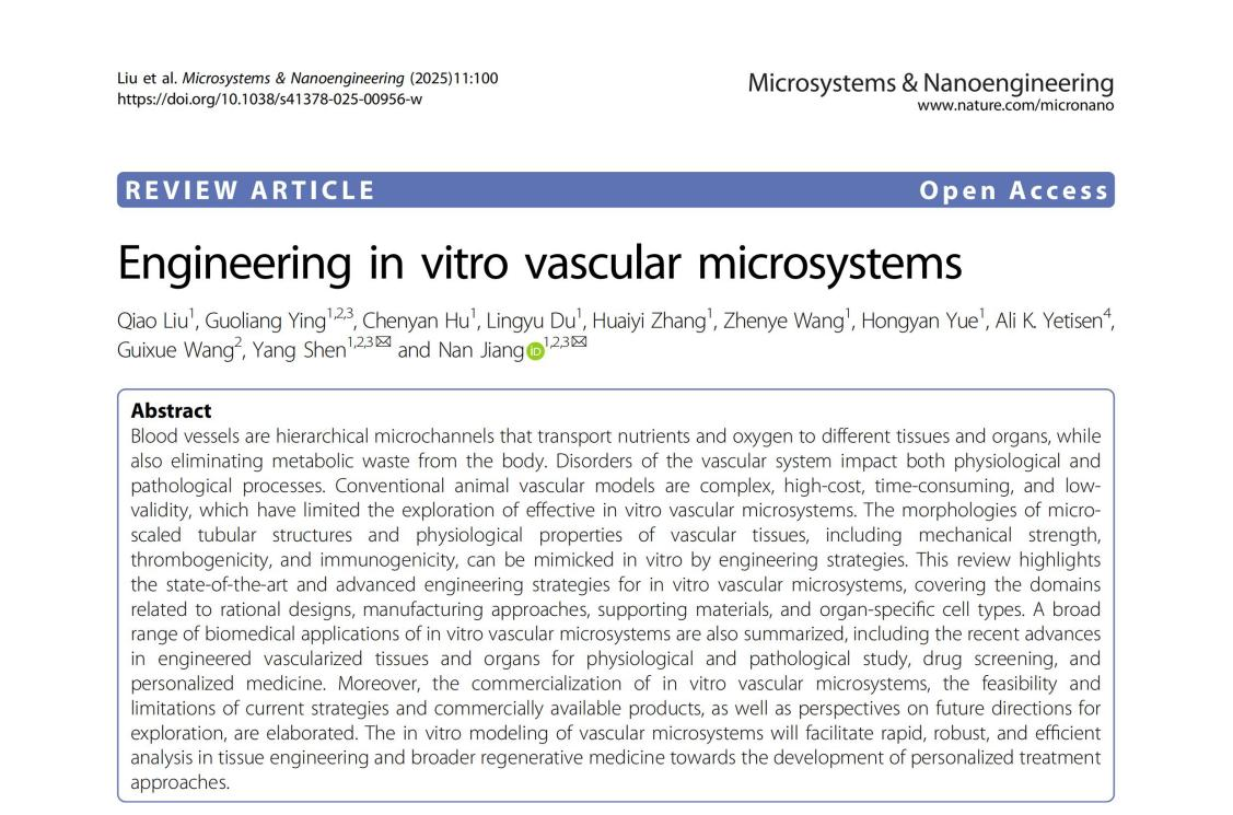 血管系统是体内运输营养和氧气、清除代谢废物的重要网络。传统动物模型因复杂、高成本、耗时及有效性不足,限制了体外血管模型的发展。因此,如何在体外构建模拟真实血管形态和功能的微系统成为了研究的热点。近日,必赢官网姜楠团队和沈阳团队在Springer Nature旗下期刊,工程技术1区杂志Microsystems &Nanoengineering(IF 9.9)上发表综述论文(图1),总结了体外血管微系统在多个生物医学领域中的广泛应用,包括工程化血管化组织与器官、药物筛选、疾病模型构建以及个性化治疗方案的开发;探讨了当前商业化策略与产品的可行性及局限性,并展望了未来的发展方向。该论文的第一作者是刘巧硕士和应国量副教授。