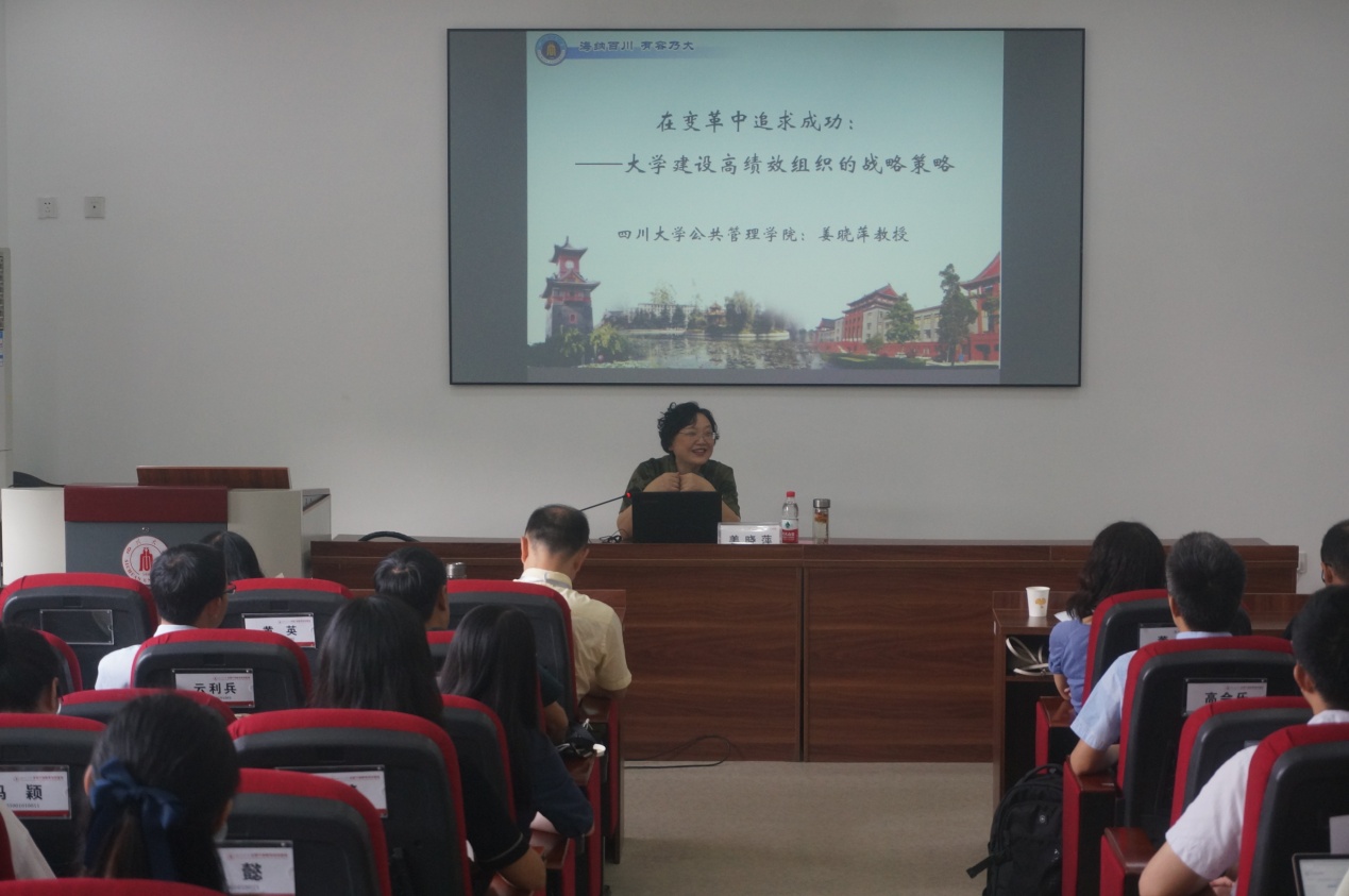 公共管理学院党委书记姜晓萍教授以“在变革中追求成功——大学建设高绩效组织的战略策略”为题讲授专题课