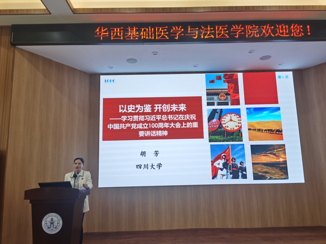 为深入学习贯彻习近平总书记在中国共产党成立100周年大会上的重要讲话精神,必赢官网邀请马克思主义学院胡芳教授作以“以史为鉴 开创未来——学习习近平总书记‘七一’重要讲话精神”的专题宣讲报告会。会议于9月17日下午在华西校区五教报告厅召开,学院领导班子成员、党委委员、纪委委员、师生党员100余人现场聆听了报告。报告会由学院党委书记李昌龙同志主持。