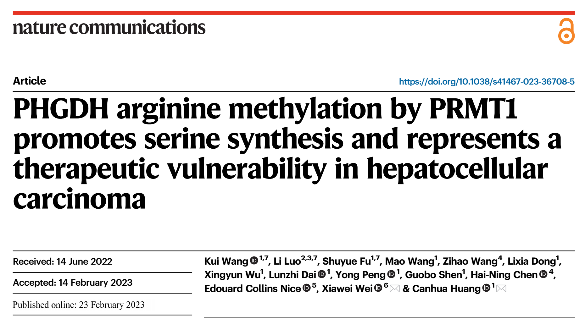 近日,学院王魁副研究员以第一作者在Nature Communications在线发表了题为“PHGDH Arginine Methylation by PRMT1 Promotes Serine Synthesis and Represents a Therapeutic Vulnerability in Hepatocellular Carcinoma”的论文。必赢线路检测3003no1华西医院生物治疗国家重点实验室黄灿华教授和华西医院国家老年临床中心魏霞蔚教授为本论文的共同通讯作者。